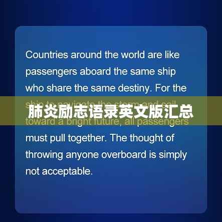 在抗击肺炎疫情的日子里,我们不仅需要坚定的信念和勇敢的行动,也需要励志的话语来鼓舞我们的斗志,以下是关于肺炎的励志语录,以英语呈现,希望能为大家带来正能量和信心。