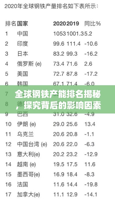 随着全球经济的不断发展,钢铁行业作为重要的基础产业,其发展状况备受关注,钢铁产能是衡量一个国家工业化水平的重要指标之一,也是国际竞争力的重要体现,本文将探讨全球钢铁产能的排名及其背后的影响因素。