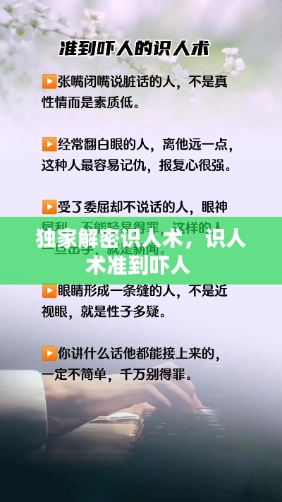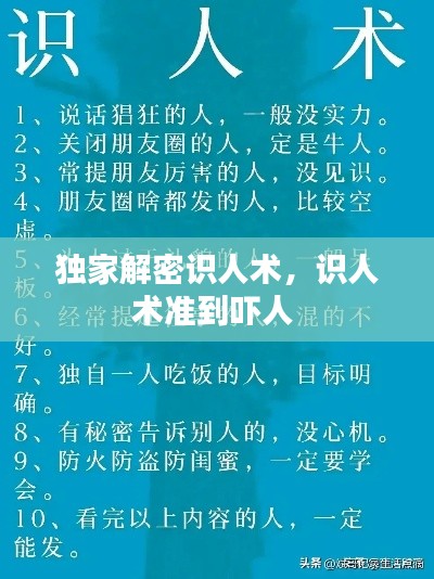 识人术是一门博大精深的学问,它可以帮助我们更好地了解他人,提高人际交往能力。在日常生活中,我们可以运用识人术来识别、评估和选择合作伙伴、朋友和恋人。然而,识人术并非万能,它需要我们结合实际情况,运用多种方法和技巧,才能达到更好的效果。让我们共同探索识人术的奥秘,成为人际交往的高手。