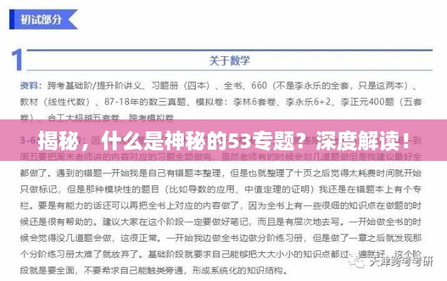 在当今社会,各种专业术语和特定话题不断涌现,53专题”便是其中之一。“53专题是什么”成为了许多人关注的焦点,本文将围绕这一主题,对“53专题”进行详细的阐述和解读。