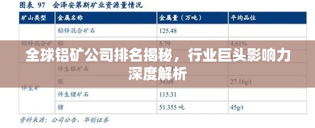 随着全球经济的发展和工业化的推进,铝作为一种重要的金属资源,其需求量日益增大,铝矿资源的开采与加工,涉及到一系列铝矿公司的运营与发展,在全球铝矿行业中,一些公司凭借其强大的实力、高效的开采技术和丰富的资源储量,脱颖而出,位居全球铝矿公司排名前列,本文将对全球铝矿公司的排名及其影响力进行分析。