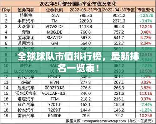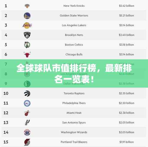 足球是全球最受欢迎的体育项目之一,其背后所代表的球队市值更是备受关注,随着足球产业的不断发展,球队市值也在不断变化,本文将为您介绍世界球队最新市值排名表,带您了解全球足球俱乐部的财富状况。