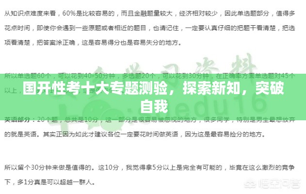 随着教育的不断发展和改革,国开性考十专题测验作为一种新型的考试形式,逐渐受到广泛关注,它旨在评估学生的综合素质和实际应用能力,为学生提供一个展示自身才能的平台,本文将围绕国开性考十专题测验展开探讨,分析其目的、内容、方法以及应对策略,以期为广大考生提供有益的参考。