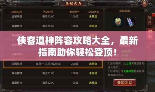 通过本文的攻略,希望玩家们能了解到《侠客道》中“神阵容”的搭配原则和最新推荐阵容,提升游戏体验和战斗实力,在游戏中不断摸索和尝试,找到最适合自己的阵容搭配,享受游戏的乐趣,未来随着游戏的更新和变化,玩家们也需要关注最新的攻略和技巧,以便在游戏中保持优势,祝愿大家在《侠客道》的世界里,成为一名真正的侠客!