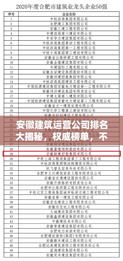 安徽省,以其深厚的文化底蕴和快速发展的经济,正逐渐成为中国建筑行业的佼佼者,随着城市化进程的加快,建筑运营行业在安徽也迎来了前所未有的发展机遇,本文将为您详细介绍安徽建筑运营公司的排名,带您了解这些企业的实力与风采。