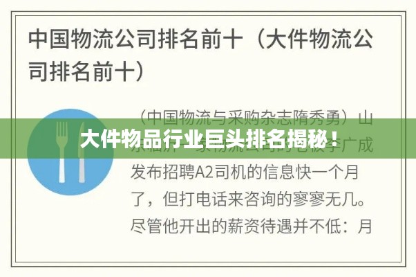 随着物流行业的飞速发展,大件物品运输领域逐渐受到广泛关注,本文将介绍在大件物品运输领域中表现突出的几家知名公司,通过综合评估其市场份额、服务质量、运输网络及创新能力等因素,为您揭示这些行业巨头的排名。