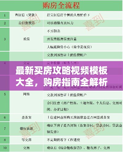 随着房价不断上涨,购房成为越来越多人关注的焦点,面对复杂的购房环境和众多的选择,如何顺利购房,避免不必要的麻烦和损失,成为许多人关注的焦点,本文为你提供最新的买房攻略视频模板大全,助你轻松购房。