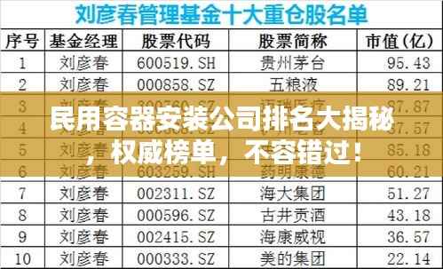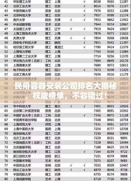 随着工业与科技的飞速发展,民用容器安装行业逐渐崭露头角,市场需求不断增长,众多民用容器安装公司如雨后春笋般涌现,形成了激烈的市场竞争格局,本文将探讨民用容器安装公司的排名,以助您了解行业内的佼佼者。