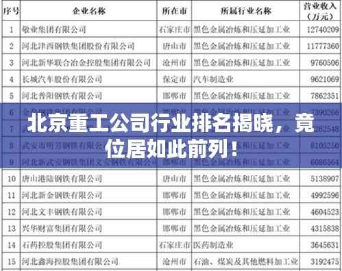 北京,作为中国的首都和经济中心,汇聚了众多知名企业,重工行业的企业尤为突出,本文将为您详细介绍北京重工公司的排名及相关情况。